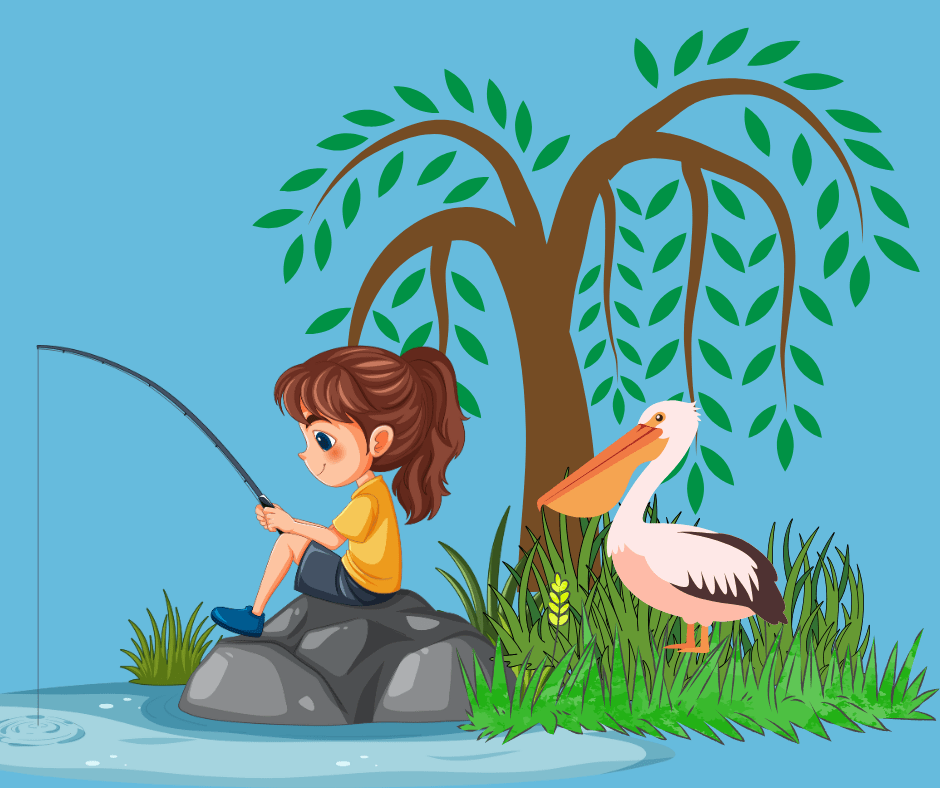 A pelikán leült mellé a partra, és elmélyülten tollászkodni kezdett. Közben néha egy-egy pillantást vetett a horgászzsinórra a vízben. Ám az úszó meg se rezzent. A pelikán türelmetlenül nyújtogatta a nyakát, Frici azonban megnyugtatta.